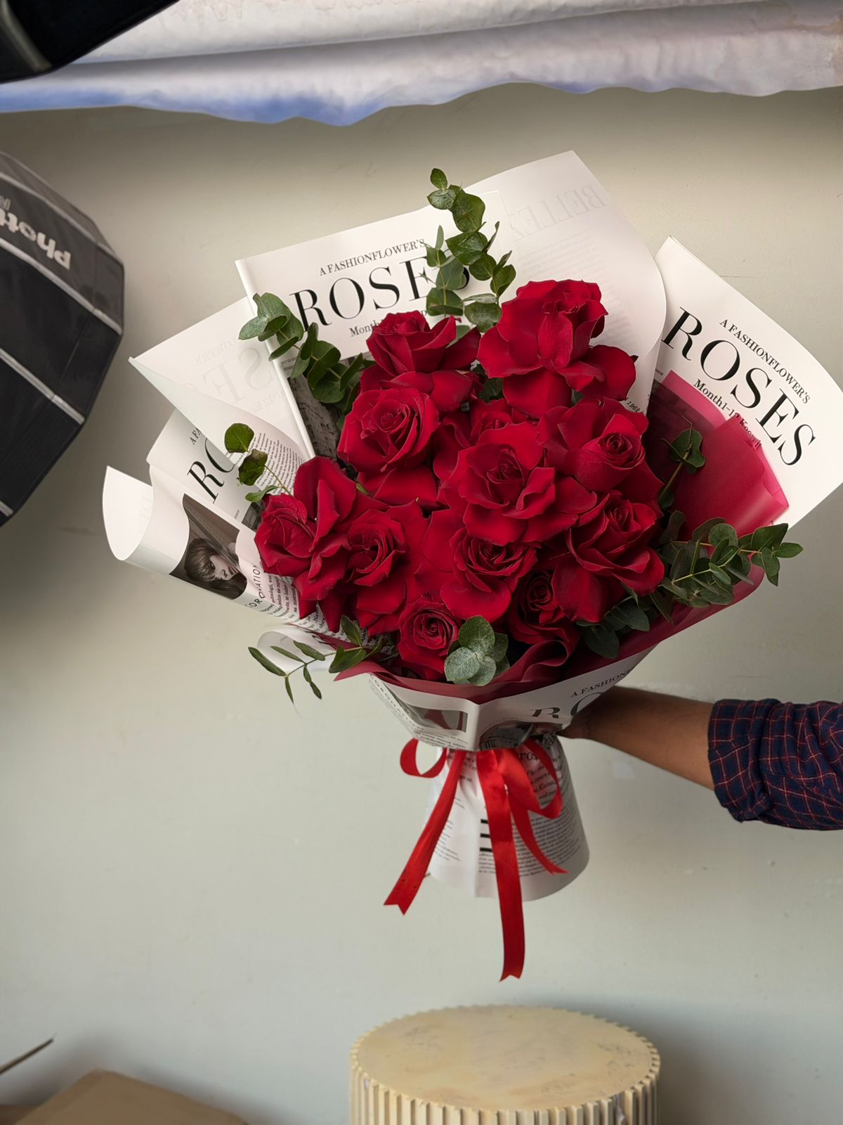 A stunning hand-tied bouquet featuring fresh red roses beautifully arranged with delicate eucalyptus greens. Wrapped in premium newspaper-style floral sheets and finished with a classic red ribbon, this bouquet blends modern elegance with timeless romance. Perfect for expressing love, admiration, and heartfelt emotions on special occasions like anniversaries, birthdays, Valentine’s Day, or romantic surprises.